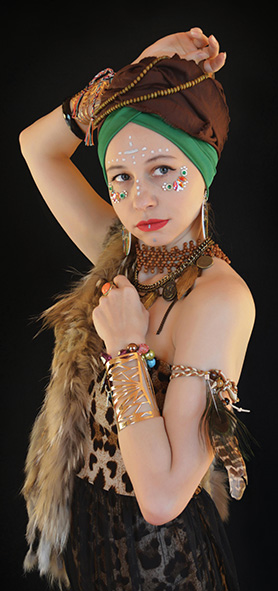 Σε ένα πορτοκαλί και ροδοκόκκινο φόντο, όμοιο με καυτή άμμο, είναι καρφιτσωμένα τα αφρικανικά κοσμήματα. Αποτελούνται από χάντρες, κοχύλια, πέτρες και μέταλλα και μας μιλούν μέσα από τα τολμηρά και περίπλοκά τους σχέδια για την ησυχία της ερήμου. Γιορτάζουν τις φυλετικές αφρικανικές παραδόσεις, μας υπενθυμίζουν τις πνευματικές τους πεποιθήσεις και διασφαλίζουν πως θα γνωρίσουμε την κοινωνική δομή της φυλής τους.